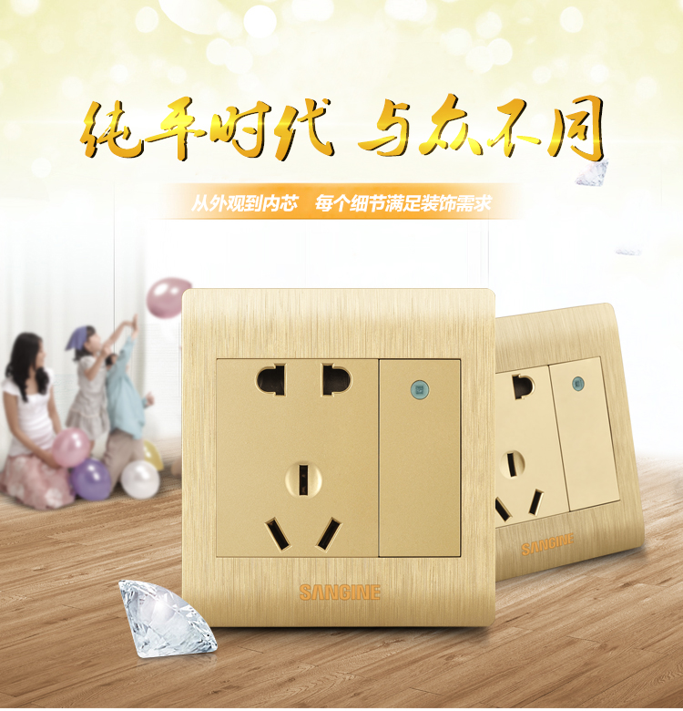 秒杀86型香槟金开关插座面板五孔带开关一开五孔插座开关面板套餐