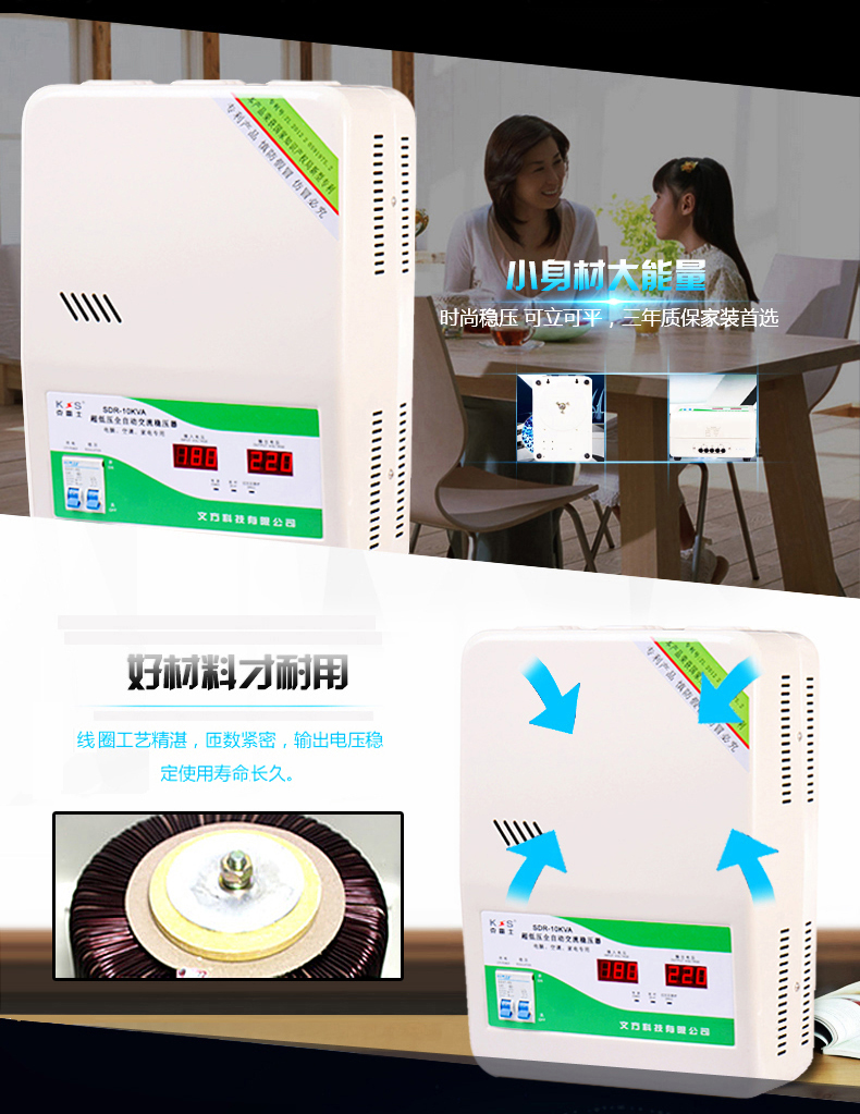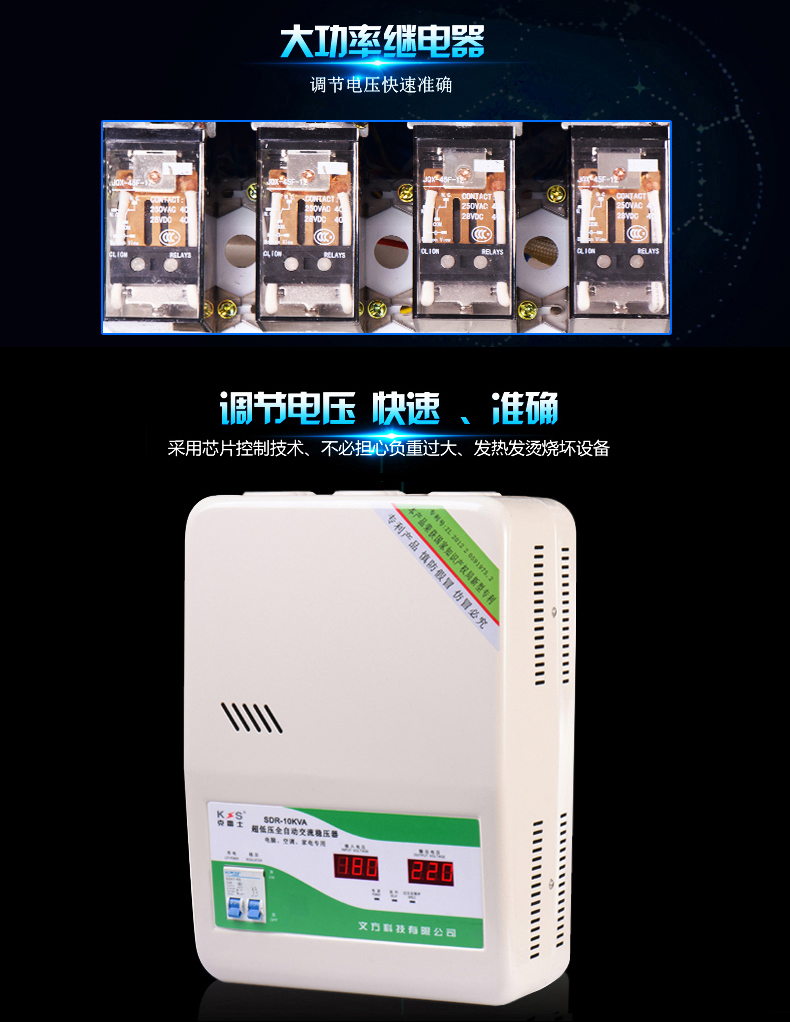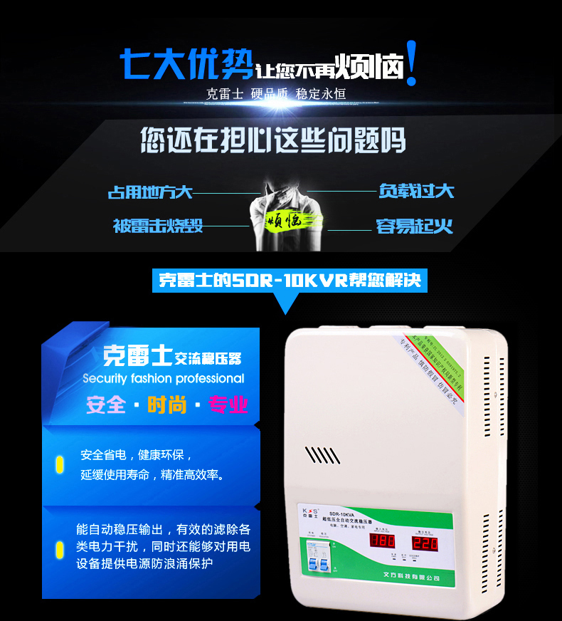 品名称:克雷士(KLS)稳压器 10000VA 10KW 家用 电脑 空调 全自动 稳压电源挂壁