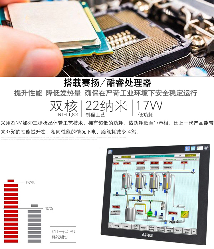优良的散热性:采用强固型五金外壳,具有优良的散热性能。采用赛扬1037U/J1900或酷睿I3/I5/I7 CPU超省电的嵌入式平台设计,整机具有优良的可靠性。具有体积小,超薄,耗电省,稳定可靠,速度快等优点。大小只相当于传统的显示器。