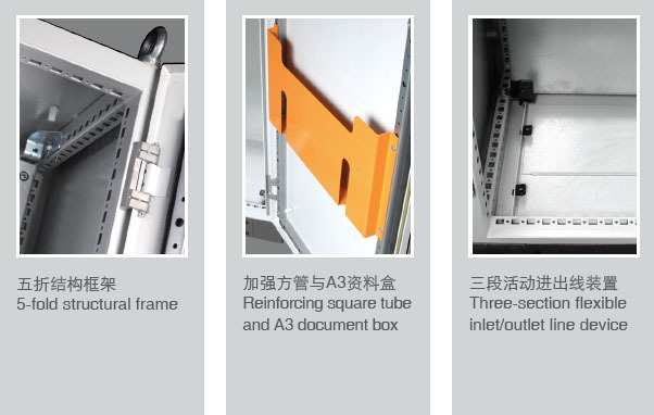 控制柜钢板厚度: 框架:五折型材1.5mm 门板:2.0mm 背板:1.5mm 安装板:2.5mm (可选3.0mm) |