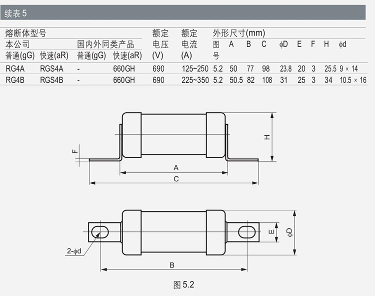 熔断体型号、外形尺寸、额定电压、额定电流见续表5及图5.2;