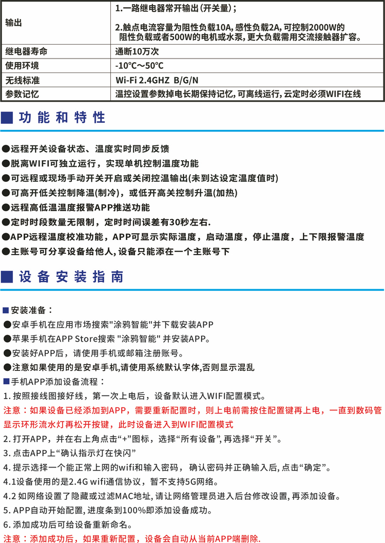 2.内置10A继电器, 最大可控制2KW阻性负载或500W感性负载,更大负载请接接触器