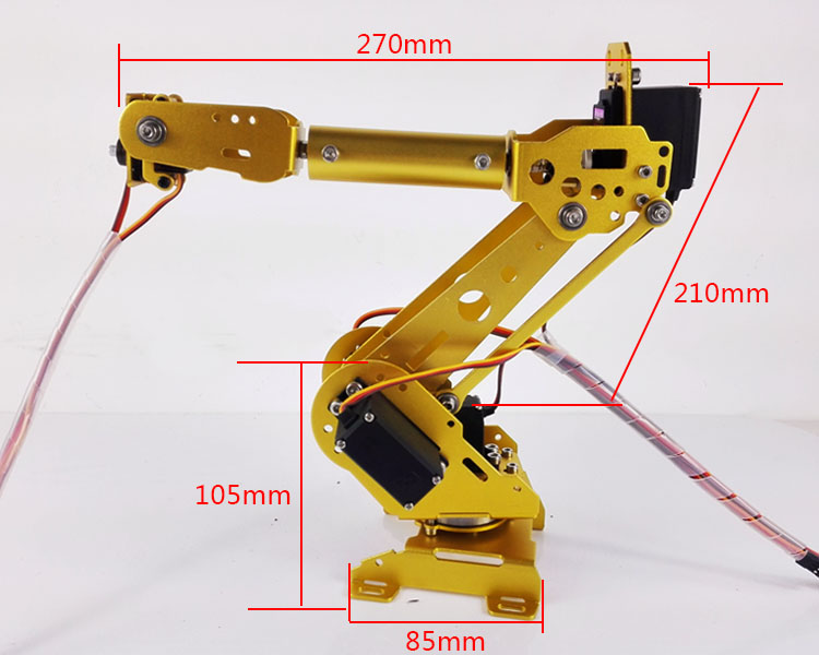 DoArm S6为四博智联doit公司开发的6自由度机械臂模型,通过WiFi控制单元,可以灵活控制机械手臂的移动、抓取等。机械手臂 6自由度机械手 , 6自由度机械臂,全金属机械臂,底部关节都是用金属齿轮舵机MG996R,力度大,结构美观实用,手臂大致尺寸如图片中所示,批次不同有时尺寸会很小变动。可联系客服免费索取源码 。